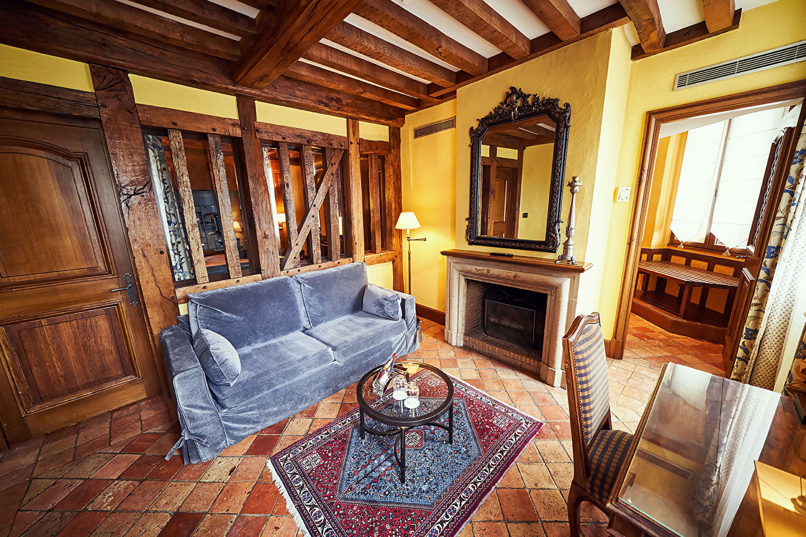 The rooms and suites also combine stone, Burgundy floor tiles and old wood panelling. Some have fireplaces, private terraces or balconies overlooking the park-garden.